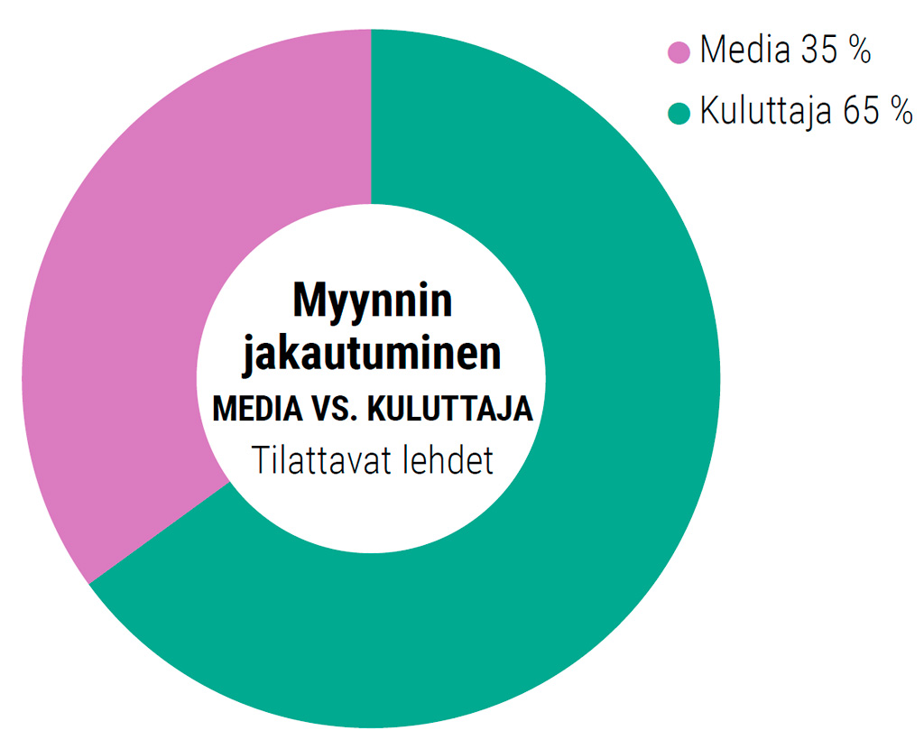 Uutismedian liiton jäsensanomalehtien vuoden 2024 nettomyynnistä (= kuluttaja- ja mediamyyntitulot) kuluttajamyynnin osuus oli 65 prosenttia ja mediamyynnin 35 prosenttia.