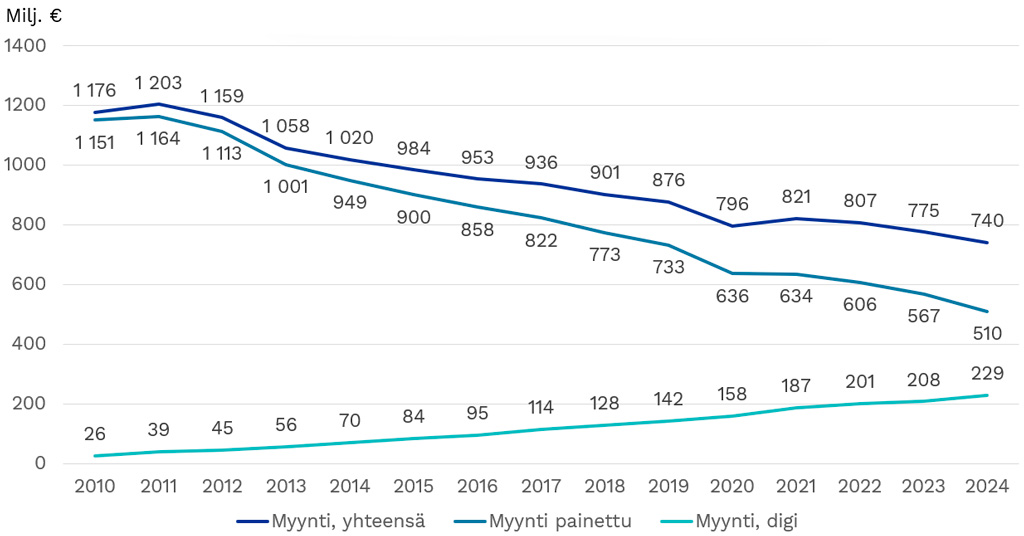 Tilattavien sanomalehtien ja kaupunkilehtien kuluttaja- ja mediamyyntitulot 2010–2024